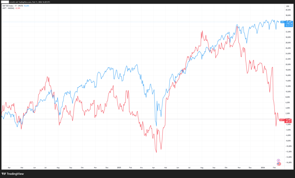 Ein gutes Beispiel für genau diese Marktmechanik war die Entwicklung der Microsoft-Aktie rund um den Jahreswechsel 2026: Während der S&P 500 im betrachteten Zeitraum um über 35 % zulegen konnte, bewegte sich eines seiner größten Schwergewichte (über 6,5 % des Index bestehen aus Microsoft-Anteilen) unter dem Strich seitwärts – obwohl die Aktie zwischenzeitlich ebenfalls rund 35 % im Plus lag. Wer Microsoft im Depot hatte, erlebte also starke Schwankungen und am Ende eine deutliche Korrekturphase, während der Gesamtmarkt optisch stabil und sogar stark wirkte.