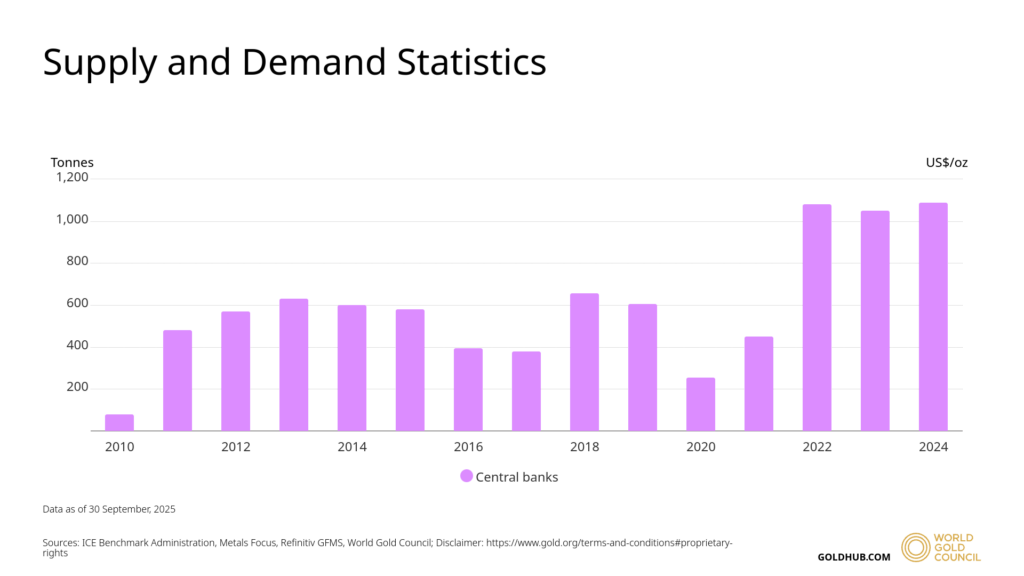 Gold war jahrzehntelang ein „langweiliges“ Thema für die Politik. Doch dieses Bild hat sich ab 2020 radikal verändert. Seitdem kaufen Zentralbanken über 1.000 Tonnen Gold pro Jahr auf, ein historisch außergewöhnlicher Wert, wie man ihn zuletzt in den 1960er-Jahren gesehen hat.