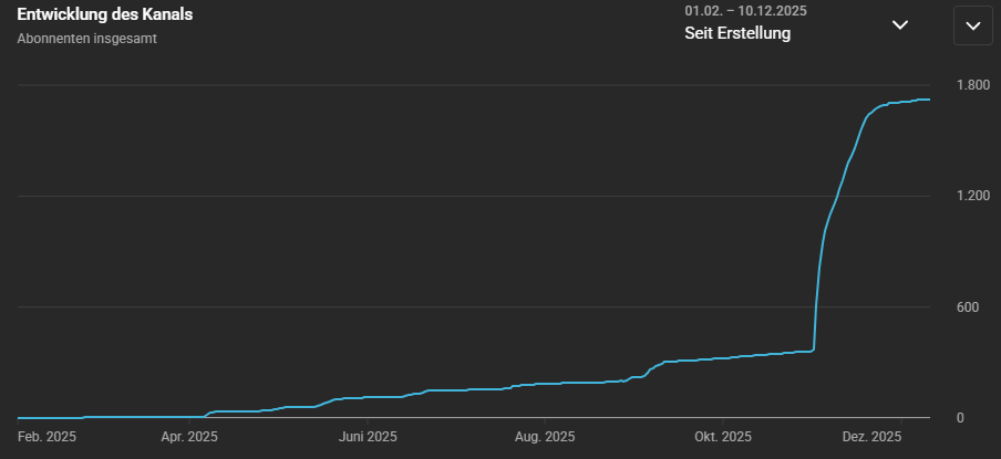 Dass der Kanal inzwischen auf dem Weg Richtung 2.000 Abonnenten ist, macht das Ganze ein bisschen ironisch – aber ja, das Wachstum kam schneller als gedacht, und das lag vor allem an einem einzigen Video, das teilweise 4.000 bis 5.000 Aufrufe pro Tag gemacht hat.