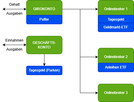• Sicherheitsfaktor: Sollte es bei einer Bank zu Problemen kommen, technische Einschränkungen auftreten oder ein Konto temporär nicht verfügbar sein, habe ich sofort ein zweites funktionsfähiges Konto, über das ich handlungsfähig bleibe und Zahlungen abwickeln kann.