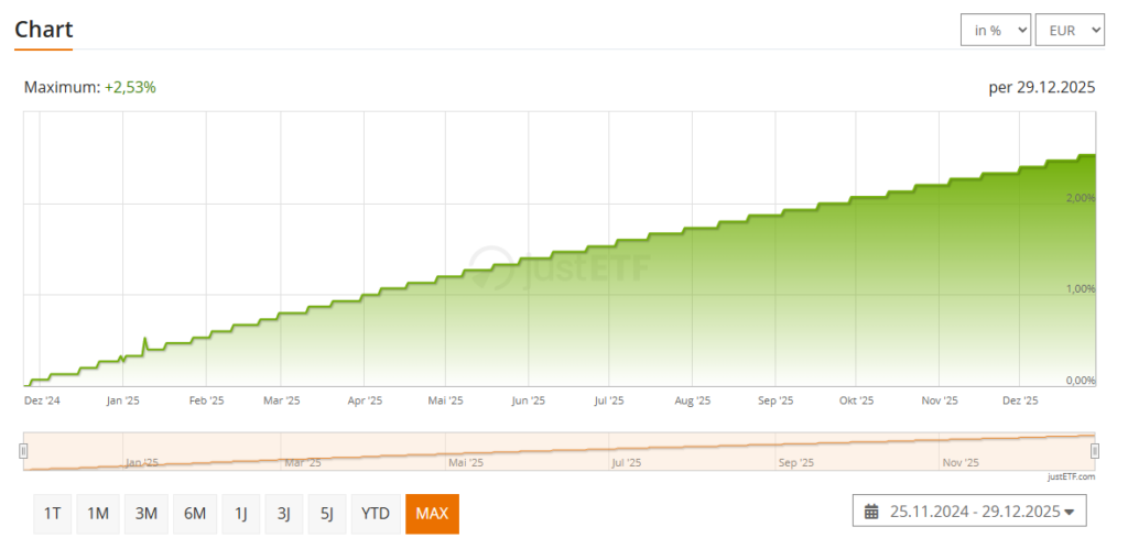 Natürlich sind Geldmarkt-ETFs nicht perfekt. Es gibt minimale Kursschwankungen, da die Anteile an der Börse gehandelt werden. Diese Schwankungen sind jedoch technisch bedingt und sehr gering. Der Zinsertrag ist dafür marktgetrieben und folgt automatisch dem aktuellen Zinsniveau. Sollten die Zinsen wieder stärker sinken und sich der Null nähern, wären solche Geldmarkt-ETFs wieder uninteressant.