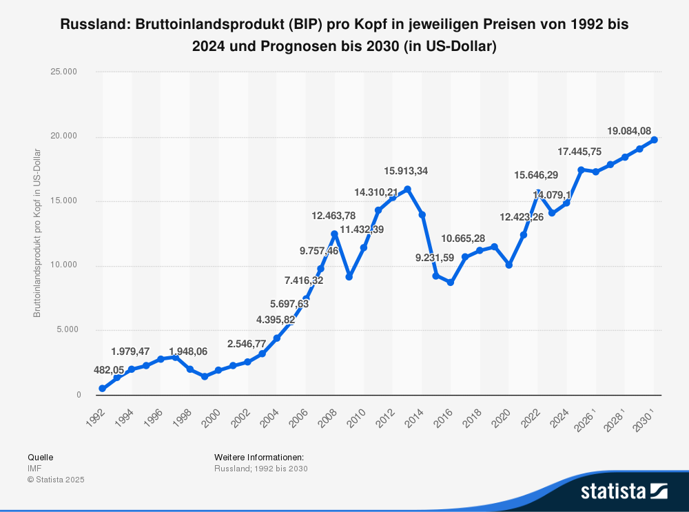Russland präsentiert aktuell beeindruckende Wachstumszahlen. Das BIP stieg im Jahr 2023 deutlich, 2024 erneut. Viele internationale Prognosen, die einen zweistelligen Einbruch erwartet hatten, lagen damit komplett daneben. Wenn du nur diese Zahlen betrachtest, könnte man denken: „Russland kommt mit allem erstaunlich gut zurecht.“ Doch die Sache ist deutlich komplexer.