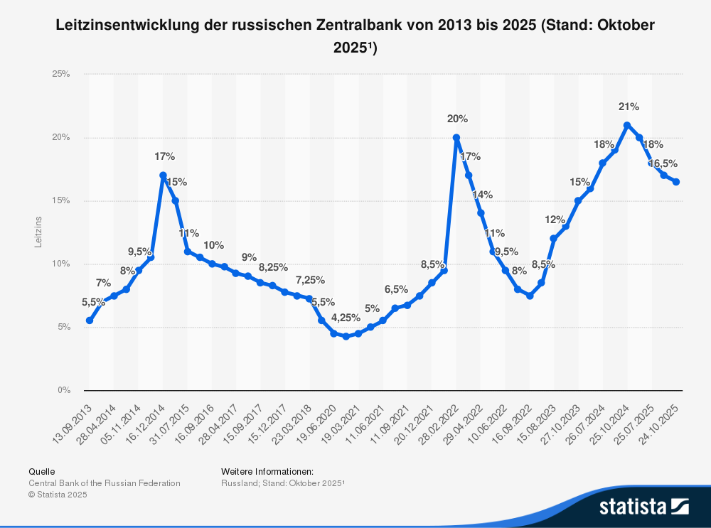 Russlands Zentralbank musste die Leitzinsen mehrfach drastisch anheben – zeitweise lag der Zinssatz bei über 20 %, heute immer noch bei einem Niveau, das die zivile Wirtschaft massiv bremst. So hohe Zinsen sorgen dafür, dass: